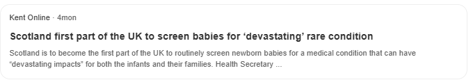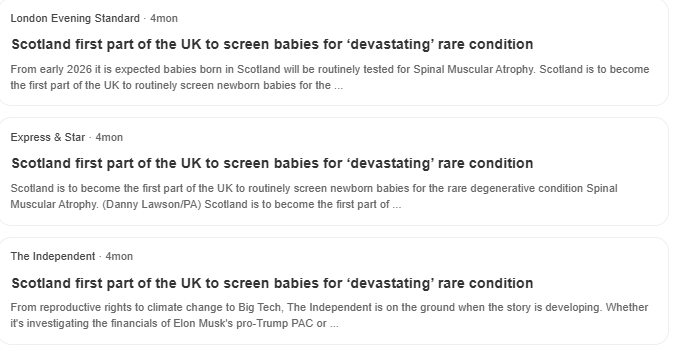 We are absolutely delighted to hear the news that NHS Scotland will be adding SMA to their newborn screening programme in an evaluative and research capacity with the aim of the first baby being tested in early 2026. External funding will be used to help purchase specialist testing equipment for the Scottish Newborn Screening Laboratory in Glasgow, and with only one testing site in the country, this means that every baby born will be screened for SMA, approximately 45,000 each year (45,763 live births in 2024). With clinical pathways already established and disease modifying treatments approved, this means those babies born will be treated pre- symptomatically and can therefore, in many cases, follow normal developmental pathways. The data generated over a 2-year period from Scottish Newborn Screening Laboratory will complement and help contribute to the UK In-service evaluation ultimately helping towards a positive UK NSC decision for SMA to be added to the bloodspot programme. This is a hugely positive step forward with Scotland joining other countries around the world who already screen for SMA.