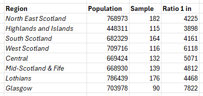 Here are the populations of 8 electoral regions in Scotland from which the list MSPs are selected, the sample for each used by YouGov and the consequent ratios: