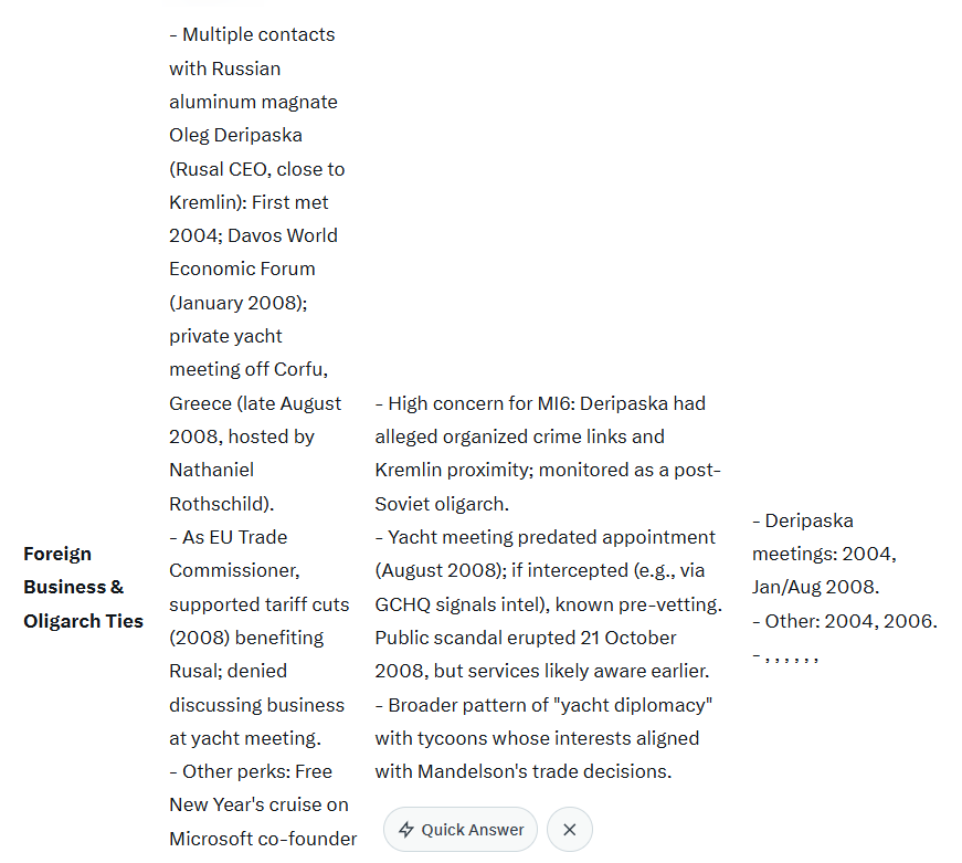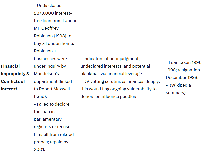 By October 2008, MI5/MI6 files would portray Mandelson as a high-value but high-risk asset: a skilled operator with proven loyalty to Labour but a track record of ethical lapses and elite foreign networks that could expose him (or UK policy) to compromise. The Deripaska ties, fresh from August, likely amplified concerns amid rising Russia tensions post-2008 Georgia invasion. No evidence suggests he was denied clearance— he served until resigning in June 2009 over the same Deripaska story—but intelligence would have briefed No. 10 on vulnerabilities. Later Epstein links (revealed 2025–2026) were unknown then. This reflects standard UK practice: vetting flags risks without always blocking appointments for political heavyweights.