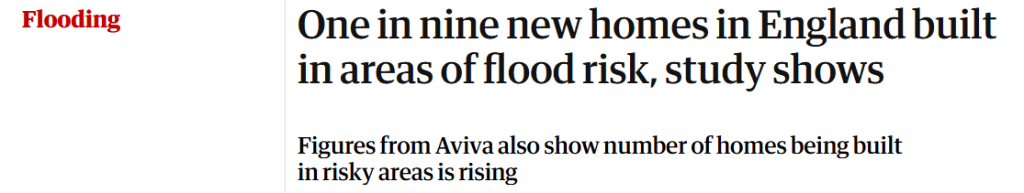 One in nine new homes in England built between 2022 and 2024 were constructed in areas that could now be at risk of flooding, according to new data. The figures show the number of homes being built in risky areas is on the rise – a previous analysis showed that between 2013 and 2022, one in 13 new homes were in potential flooding zones. The research comes with the government under huge pressure to deliver new affordable housing, amid signs that the climate breakdown is accelerating.