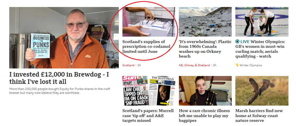 Supplies of prescription-strength co-codamol will be limited until the summer, the Scottish government has confirmed. A UK-wide shortage of the strongest form of the painkiller – the 30/500mg dosage – is ongoing due to the Indian government delaying the authorisation to import ingredients required to make the drug there. The Scottish government told BBC Scotland News, alternative treatment options will be offered to those affected by the shortages.