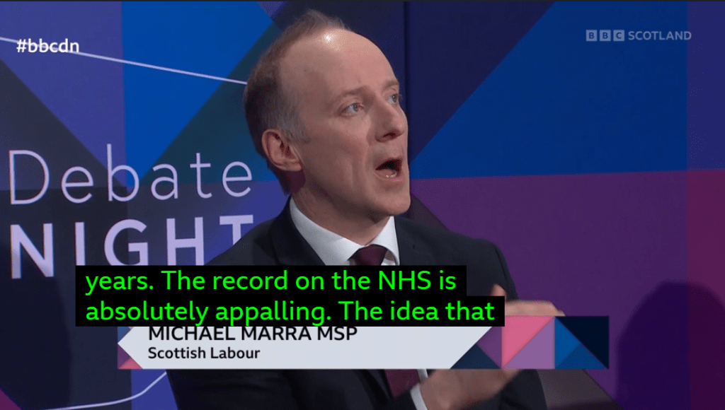I know it has a tiny audience, but Michael Marra of ‘Scottish’ Labour had a rant on BBC Scotland’s Debate Night, of such hysterical dishonesty and fear for the near extinction event they face in May , I feel obliged to respond.