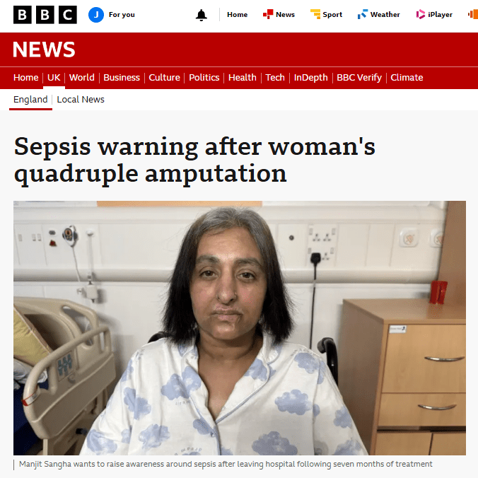 After 32 weeks in hospital, several cardiac arrests and a quadruple amputation, sepsis survivor Manjit Sangha has finally returned home. Despite medics thinking the 56-year-old would almost certainly die, she left Ward 9 at Moseley Hall in Birmingham on Wednesday, receiving a hero’s welcome from her family in Penn, on the Wolverhampton/Staffordshire border. Doctors believe her sepsis might have been caused by something as innocent as a lick from her dog on a small cut or scratch.