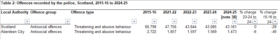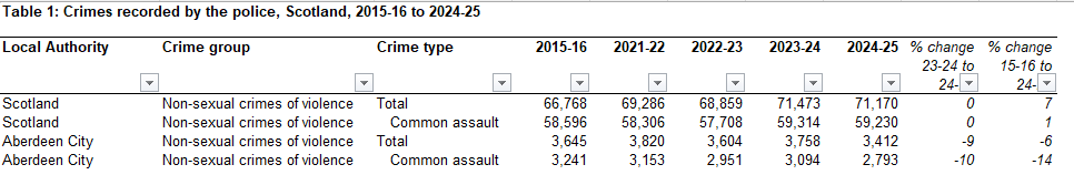 Above, the crimes of violence in Scotland overall and in Aberdeen, as recorded by Police Scotland in Recorded Crime in Scotland: year ending September 2025. Violent crime across Scotland has increased recently in Scotland, down slightly last year, but has fallen significantly in Aberdeen City.