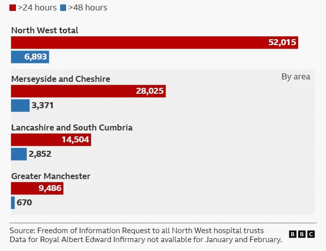 More than 52,000 patients waited longer than 24 hours to be admitted to hospitals across north-west England last year, a BBC investigation has revealed. Known as “corridor care”, patients are lining up on trolleys or sitting on chairs, stuck in A&E because there are no beds for them in the wards. The Royal College of Nursing has described the situation as a “national emergency” and called on the government to end the practice.