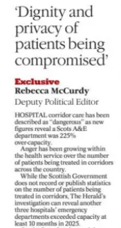 The Herald above, in February 2026, based on unreliable statistical methods by the Daily Record (No surprise there) has misrepresented the level of ‘corridor care‘ in Scotland’s hospitals. BBC Scotland, then simply spread them, uncritically.