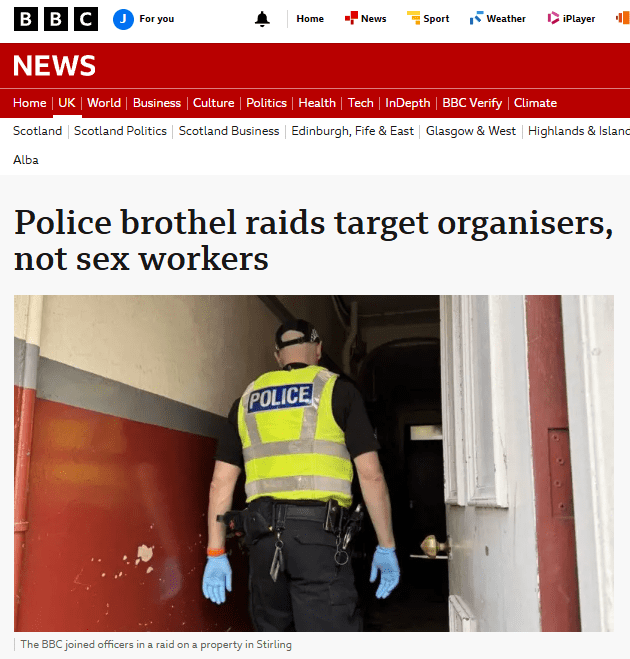 Police Scotland has targeted a number of suspected brothels across Stirling and Falkirk as part of a national strategy to address prostitution and sexual exploitation. The BBC was given exclusive access to a raid and witnessed officers simultaneously entering a business and a flat where they carried out searches and seized items.