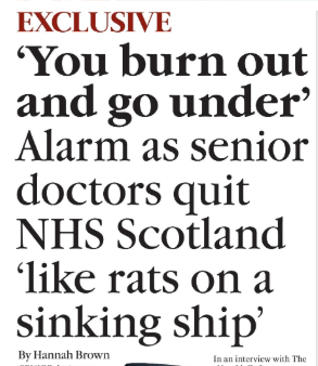 In the Herald today, based on an interview with Dr Joanna Bredski, Consultant Psychiatrist in Borders Region, formerly in Yorkshire, chair of the BMA Scotland Consultant’s committee, this crazed headline