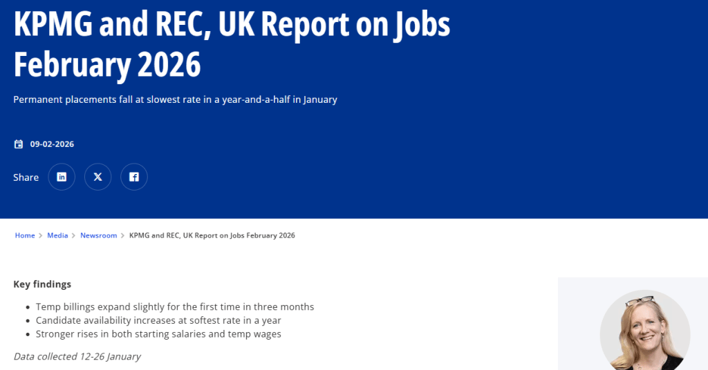 On hiring, there are signs of stabilization or modest improvements in permanent and temporary placements in early 2026, from REC/KPMG Report on Jobs. https://kpmg.com/uk/en/media/press-releases/2026/02/kpmg-rec-uk-report-on-jobs.html