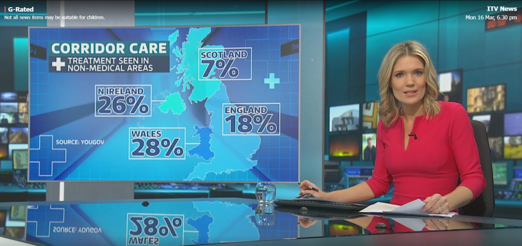 Journalists also spoke with 40 people who said they had witnessed or experienced corridor care in hospitals run by the health board. A nurse at Ysbyty Gwynedd, who spoke anonymously, claimed treating patients in corridors has become “normal”. https://www.itv.com/news/wales/2026-03-16/thought-i-was-going-to-die-investigation-reveals-reality-of-corridor-careRegular