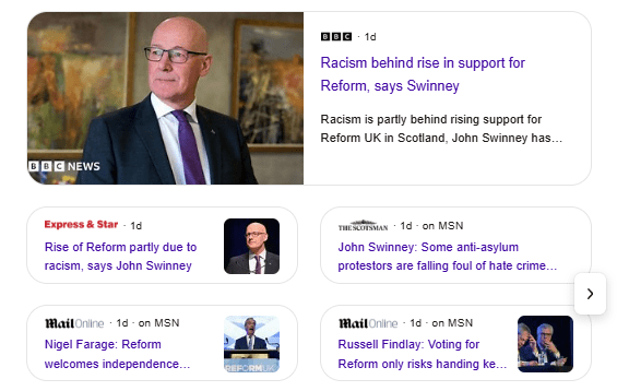 See that ‘across the political spectrum’ bit? You might justifiably expect to hear what the larger SNP and Conservative parties had to say about Reform UK. Maybe even the Greens after they beat them in Manchester?