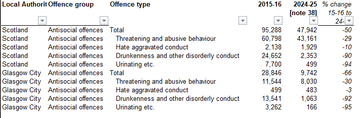 From Recorded Crime in Scotland, 2024-25, published in June 2025, the above figures show that anti social behaviour crimes in Glasgow have plummeted by 66%, from 28 406 ten years ago, to 9 742 last year. https://www.gov.scot/publications/recorded-crime-scotland-2024-25/documents/