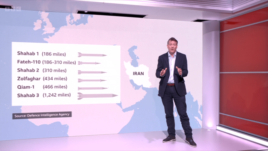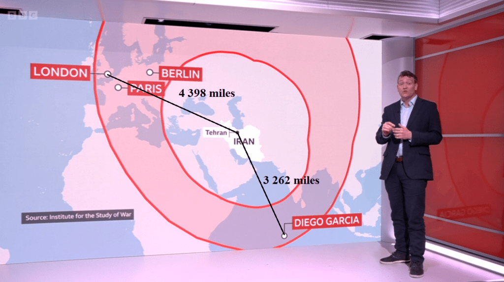 BBC UK tonight telling us that Iran, after hitting Diego Garcia, could hit European cities including London with one of its long range missiles and showing us the above ranges. It was like 2003 and Iraq’s missiles, we were told then, a threat within only 45 minutes of hitting the UK.