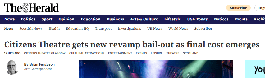 BBC Scotland this morning reporting the Citizens Theatre revamp funds being made available last minute but with no time, it seems, to tell you who from.