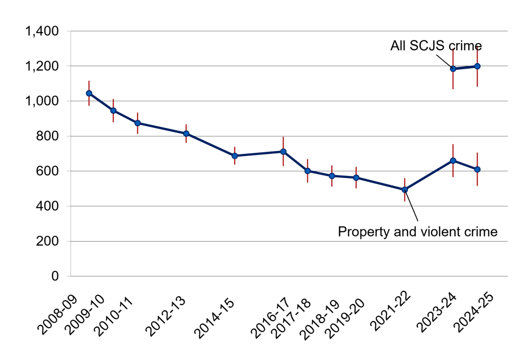 Results from the Scottish Crime and Justice Survey (SCJS) show that one-in-five (20.8%) adults were estimated to have experienced at least one crime in 2024-25. This included property crime (9.4% of adults), violent crime (2.5%) and for the second time fraud and computer misuse (11.5%). The latest findings show that the overall level of property and violent crime combined and the likelihood of being a victim of these crimes has fallen since 2008/09 but have been stable in recent years. https://www.gov.scot/publications/safer-communities-and-justice-statistics-monthly-data-report-march-2026/pages/statistics-on-crime-in-general/