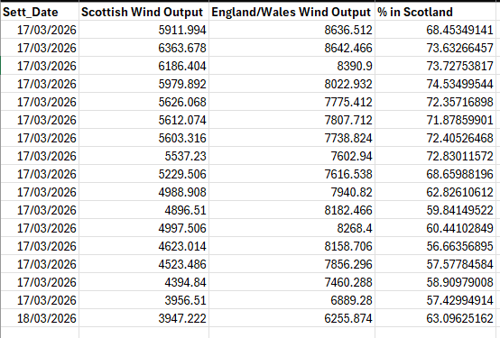 The figures for Scotland on 25 March 2026 are not yet available but a week ago, they accounted for between 57% and 72% of the UK figure with only 8% of the population and 8% of the demand.