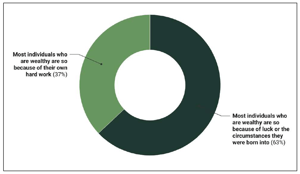 First (above) on views of how wealth comes about, a majority of nearly two in three (63%) selected that most individuals are wealthy because of luck or the circumstances they were born into, while over one in three (37%) selected that most individuals are wealthy because of their own hard work. Page 12.