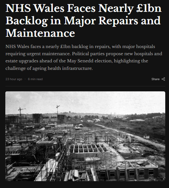 From the BBC News website (April 2) there is this: ‘NHS Wales major repairs backlog nears £1bn’.