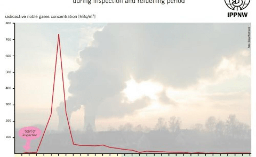 According to the International Physicians for the Prevention of Nuclear War (IPPNW) in Germany, the normal emission concentration during the rest of the year is about 3 kBq/m³, but during inspection/refuelling (in the afternoon and evening of September 22nd) this concentration abruptly increased to ~700 kBq/m³ with a peak of 1,470 kBq/m³. In the following days (September 22nd – 29th), the concentrations of released radioactive noble gases were still much higher (average = 100 kBq/m³) than during normal power operation.
