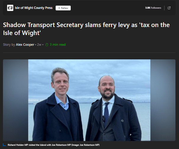 Finally, to illustrate the appalling prices, in December 2025, Joe Robertson, Tory MP for the Isle of Wight called again for measures to end the ‘ferry rip-off punishing coastal Britain’ [sic].1