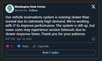 Prior to the announcement, a number of people took to social media to report the site crashing around 10 a.m. Several minutes later, Washington State Ferries sent an alert saying the reservation system was “running slower than normal due to extremely high demand.”