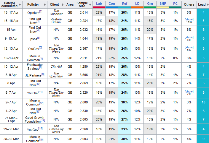 Reform UK in Westminster polls – ahead consistently with up to a third of the voters.