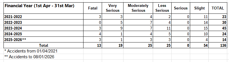From the post pandemic peak in 2023/2024 of fatal/very serious and total collisions, we can see a dramatic fall in 2024/2025, contrary to that claimed in the media report at the top here, and what seems likely to be a further fall in 2025/2026 with only 14 in 9 months.
