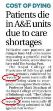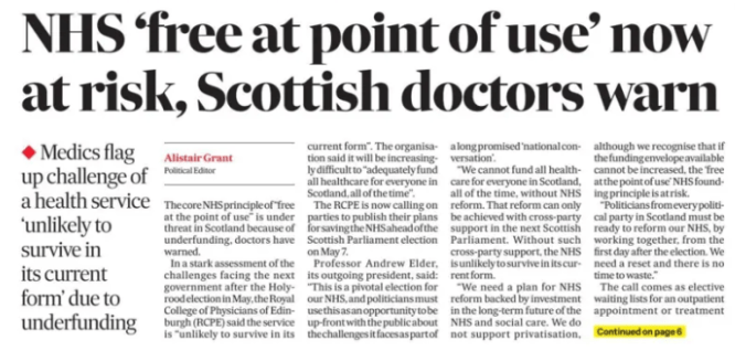 On the front page of the Sunday Post, the above, aimed at its elderly audience to provoke another ‘That SNP!’ reaction, days before an election is from Geriatrician, Professor Andrew Elder (sic) of the Royal College of Physicians of Edinburgh. You see those ‘reports’? Indeed, no figures, no sources.