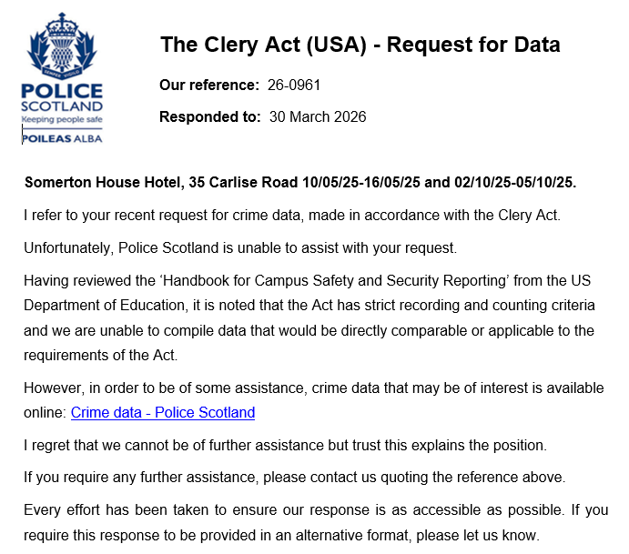 From Police Scotland – 26-1005 – Clery Act Request (USA University) Date and time of release: April 15, 2026 18:36 Reference: 26-1005 – Clery Act Request (USA University), published today: https://www.scotland.police.uk/access-to-information/freedom-of-information/disclosure-log/disclosure-log-2026/april/26-1005-clery-act-request-usa-university/
